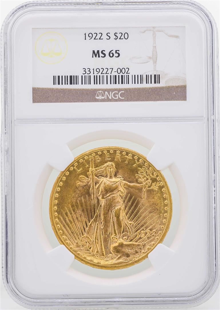 One 1922-S $20 St. Gaudens Double Eagle Gold Coin NGC MS65. NGC Certified.