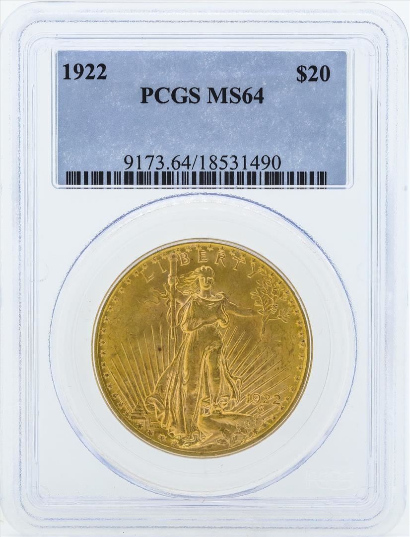 One 1922 St. Gaudens Double Eagle Gold Coin PCGS MS64. PCGS Graded.