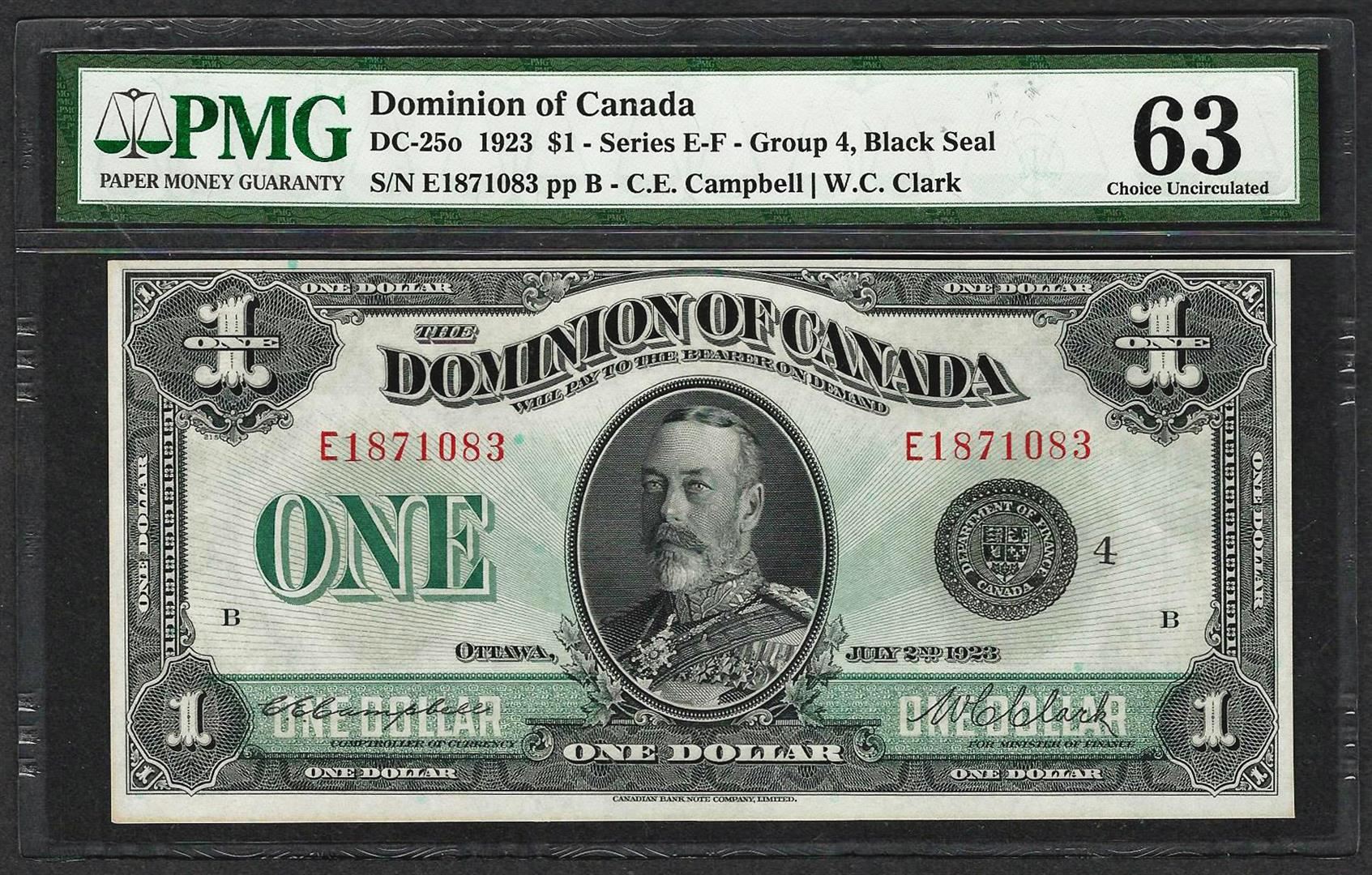 One 1923 $1 Dominion of Canada Bank Note DC-25o PMG Choice Uncirculated 63. PMG Certified.