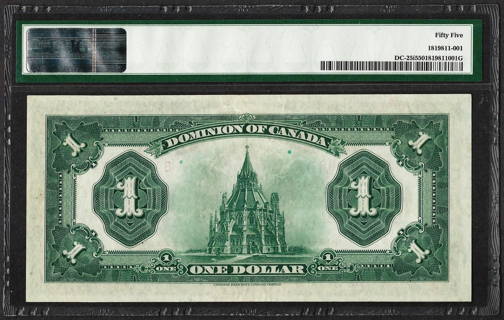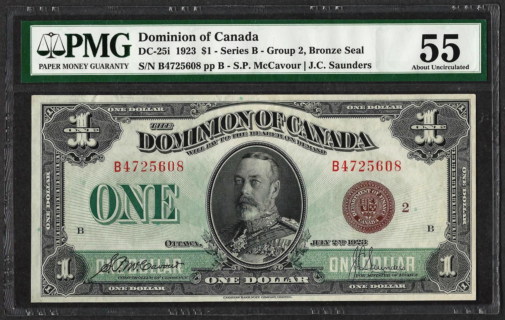 One 1923 $1 Dominion of Canada Note DC-25i PMG About Uncirculated 55. PMG Certified.