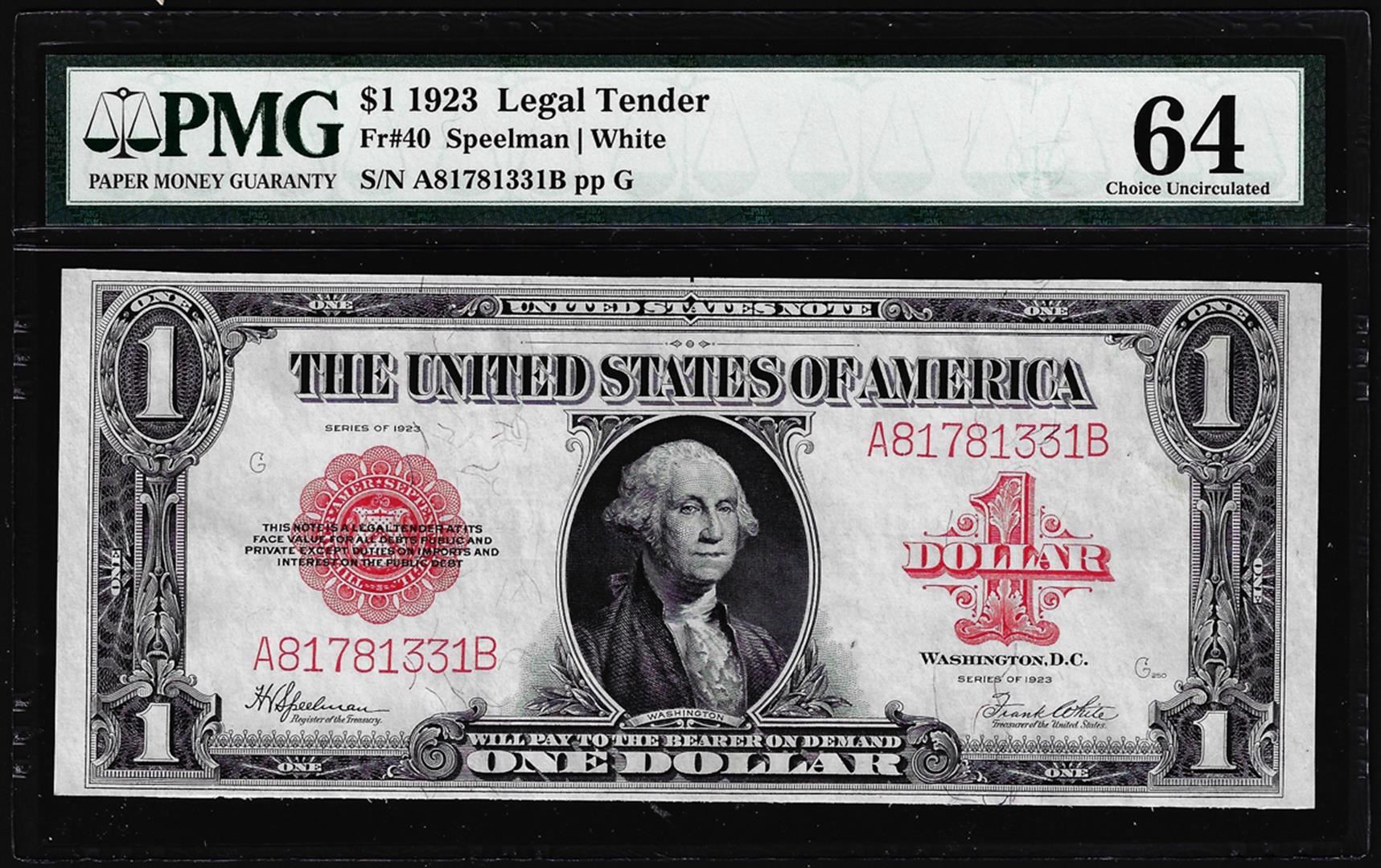 One 1923 $1 Legal Tender Note Fr.40 PMG Choice Uncirculated 64. PMG Certified.