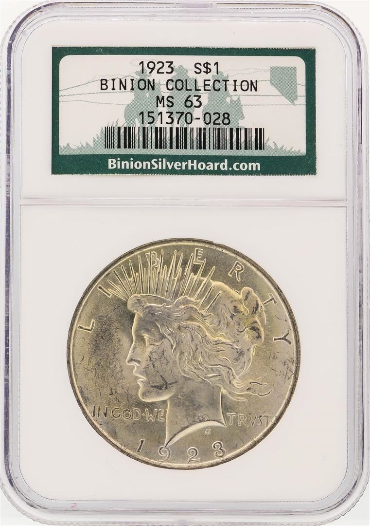 One 1923 $1 Peace Silver Dollar Binion Collection NGC MS63. NGC Certified.