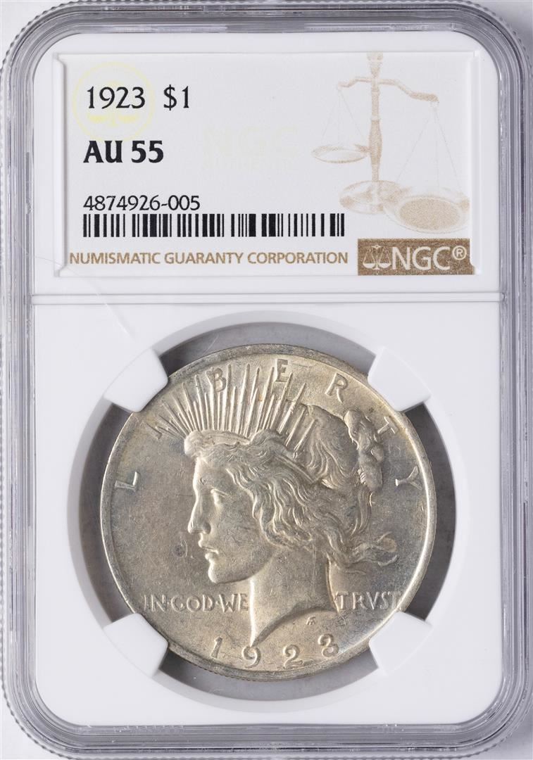 One 1923 $1 Peace Silver Dollar Coin NGC AU55. NGC Certified.