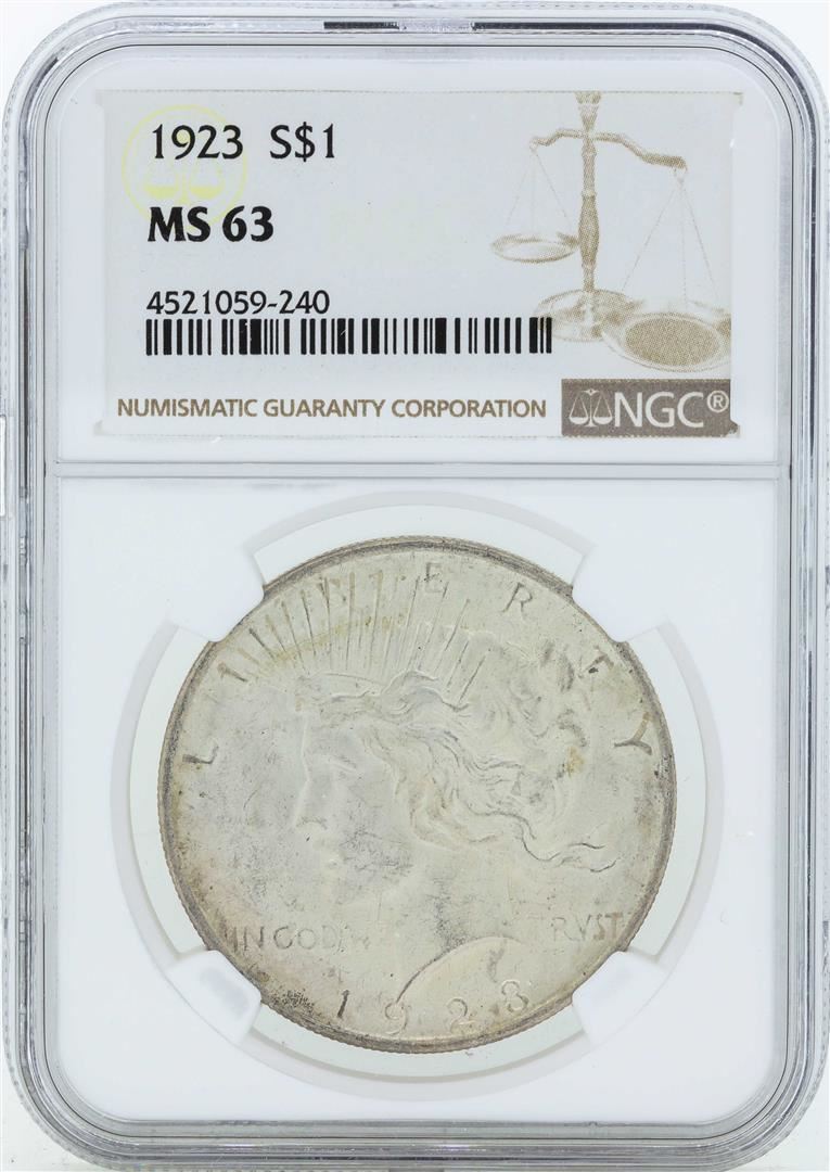 One 1923 $1 Peace Silver Dollar Coin NGC MS63. NGC Certified.
