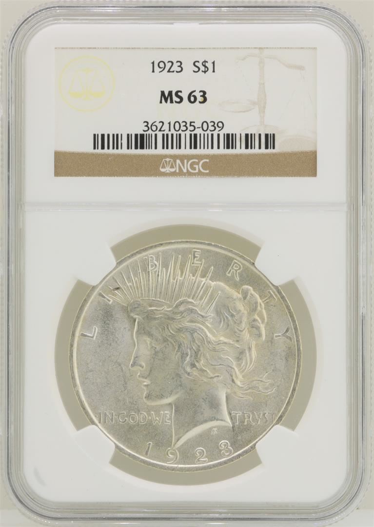 One 1923 $1 Peace Silver Dollar Coin NGC MS63. NGC Certified.