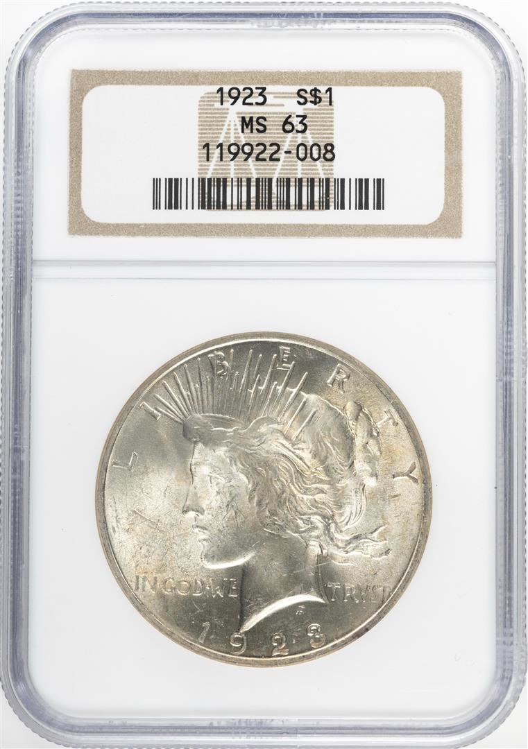 One 1923 $1 Peace Silver Dollar Coin NGC MS63. NGC Certified.