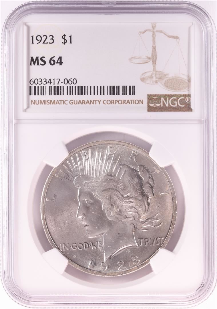 One 1923 $1 Peace Silver Dollar Coin NGC MS64. NGC Certified.