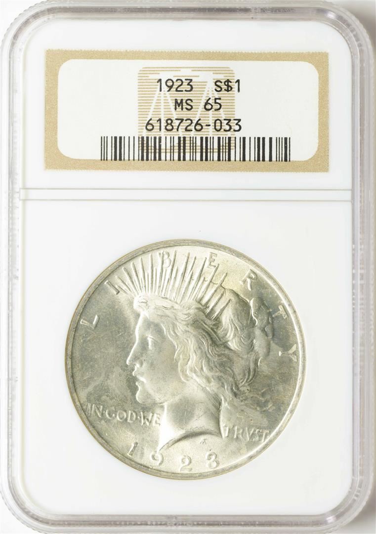 One 1923 $1 Peace Silver Dollar Coin NGC MS65. NGC Certified.