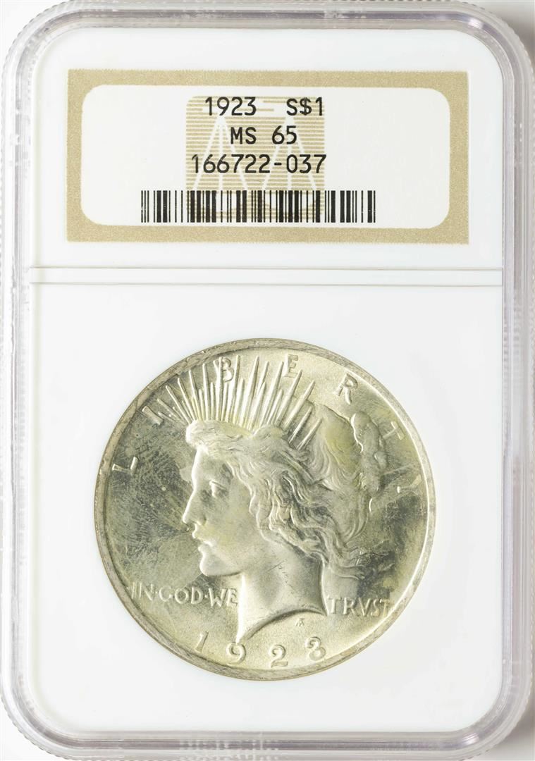 One 1923 $1 Peace Silver Dollar Coin NGC MS65. NGC Certified.