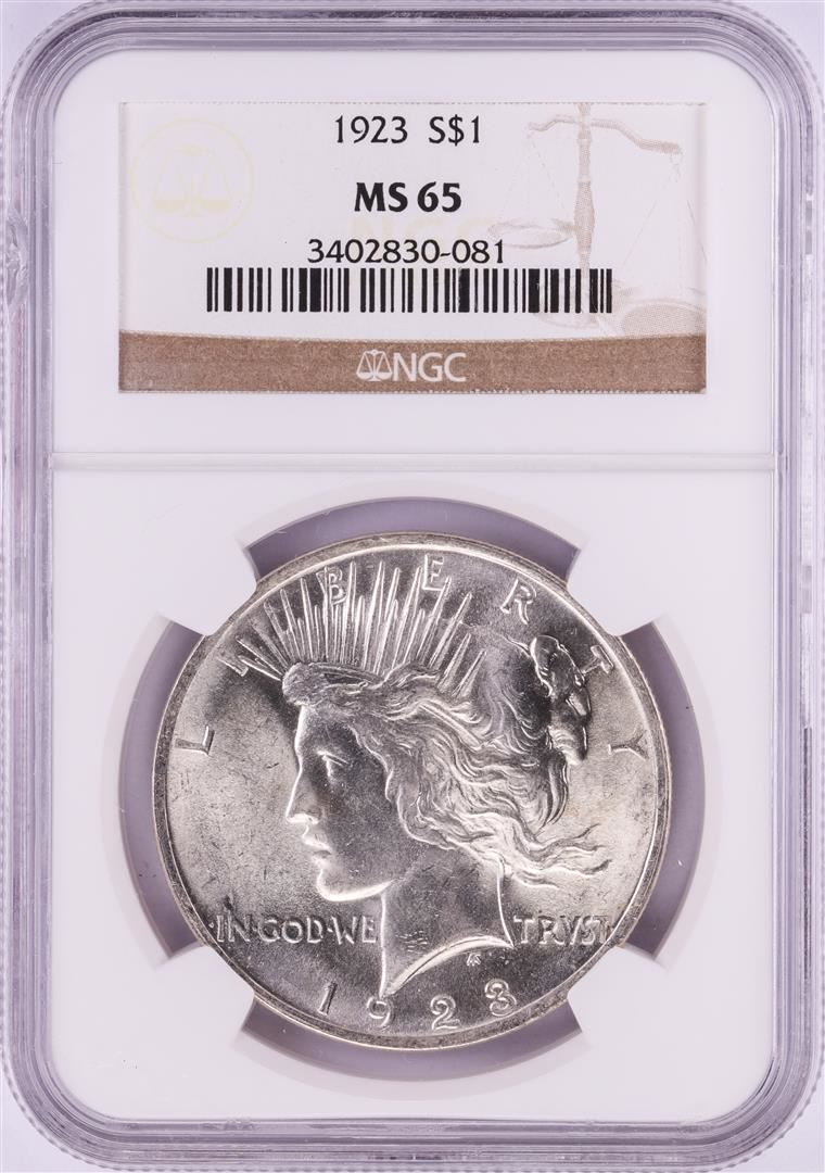 One 1923 $1 Peace Silver Dollar Coin NGC MS65. NGC Certified.