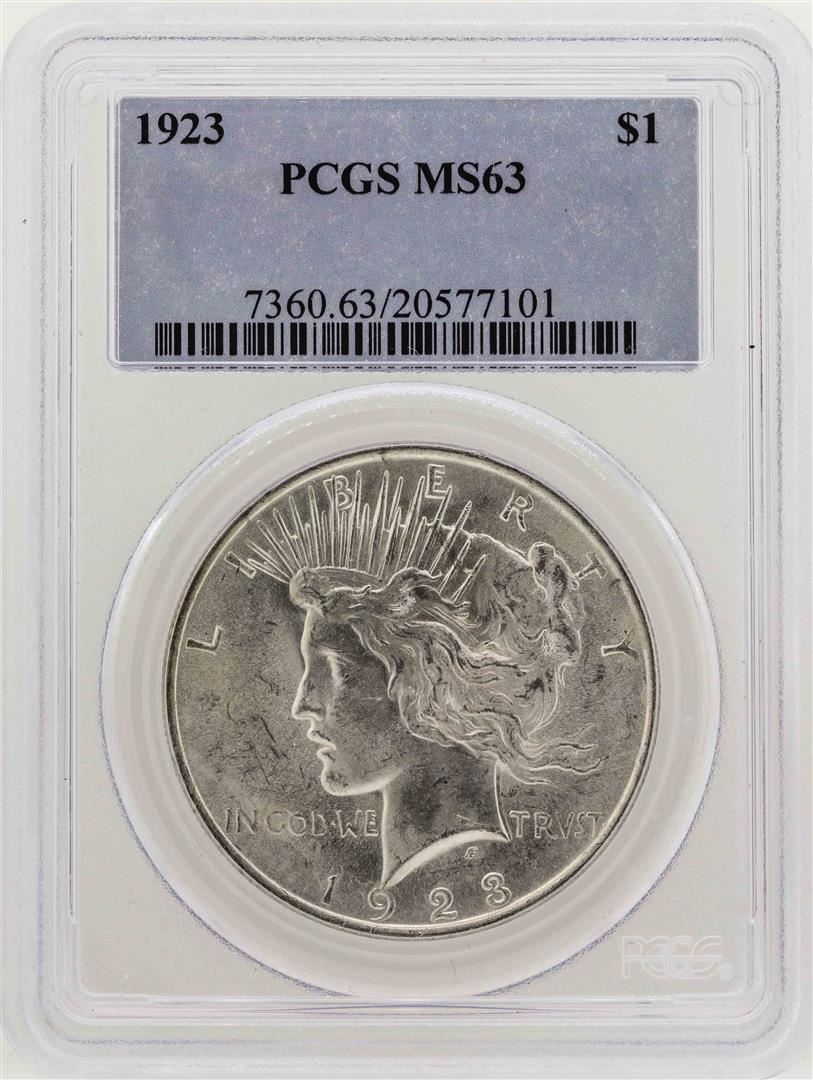 One 1923 $1 Peace Silver Dollar Coin PCGS MS63. PCGS Graded.