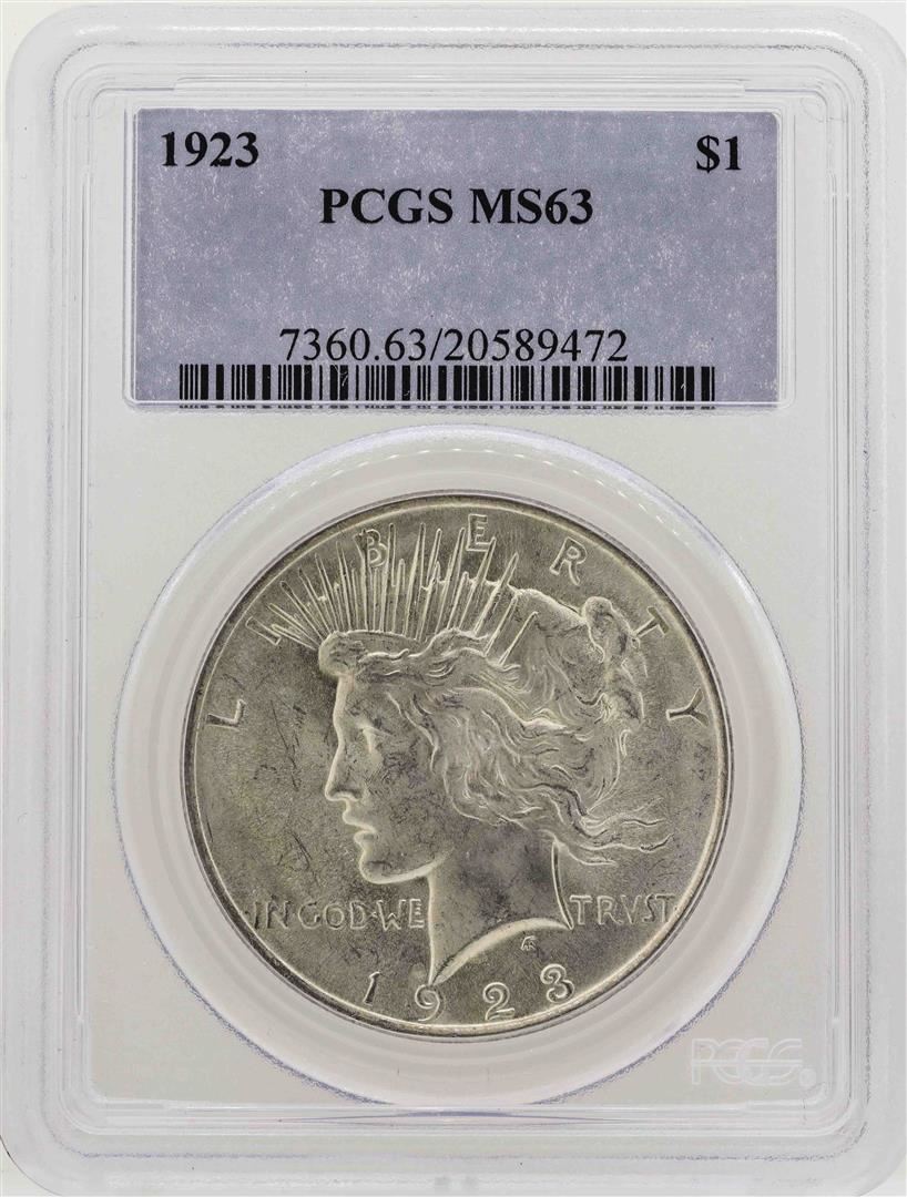 One 1923 $1 Peace Silver Dollar Coin PCGS MS63. PCGS Graded.