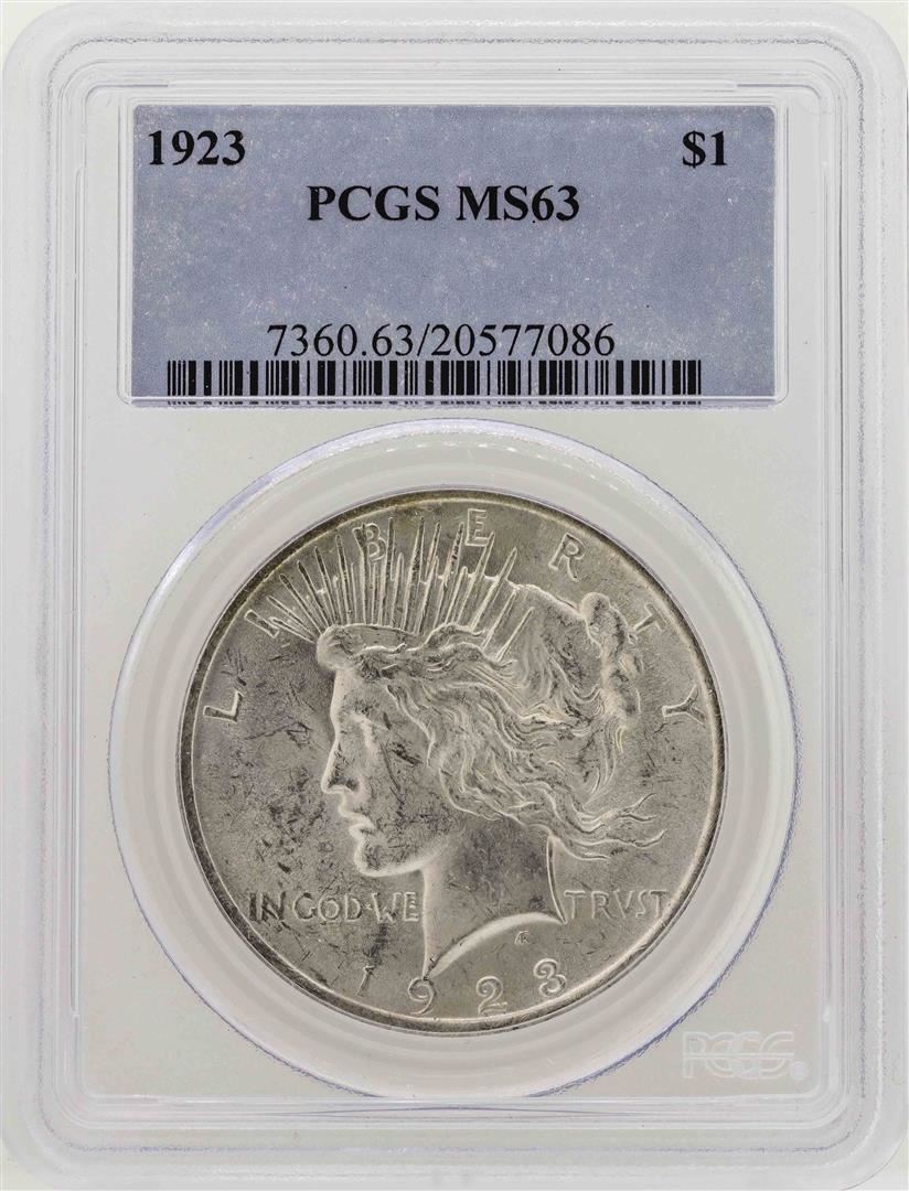 One 1923 $1 Peace Silver Dollar Coin PCGS MS63. PCGS Graded.