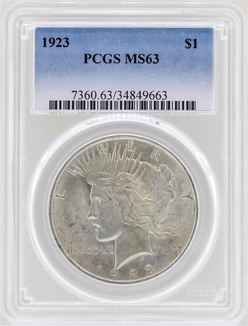 One 1923 $1 Peace Silver Dollar Coin PCGS MS63. PCGS Graded.