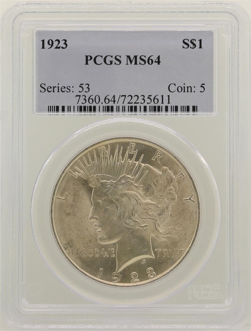 One 1923 $1 Peace Silver Dollar Coin PCGS MS64. PCGS Graded.