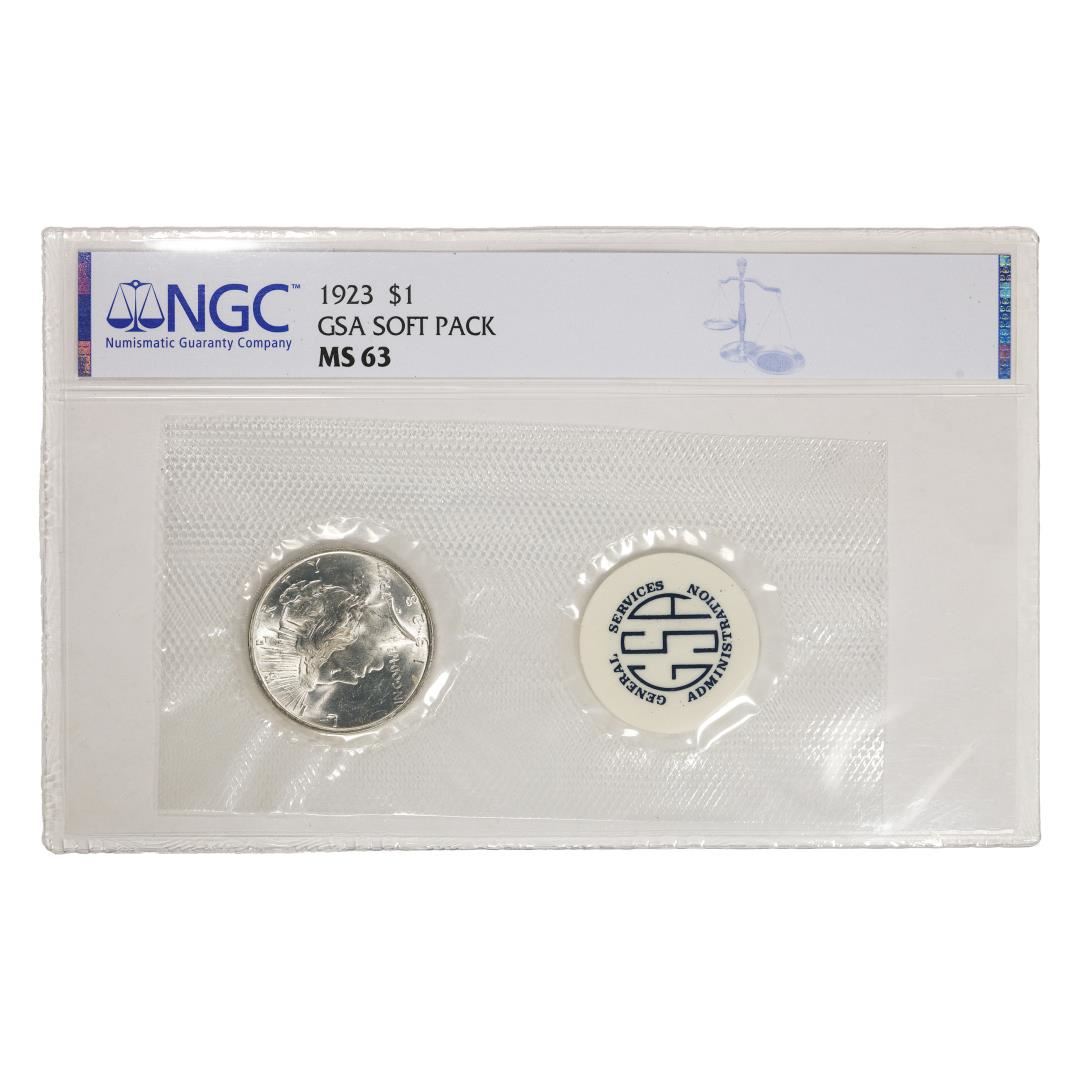 One 1923 $1 Peace Silver Dollar Coin in GSA Soft Pack NGC MS63. NGC Certified.