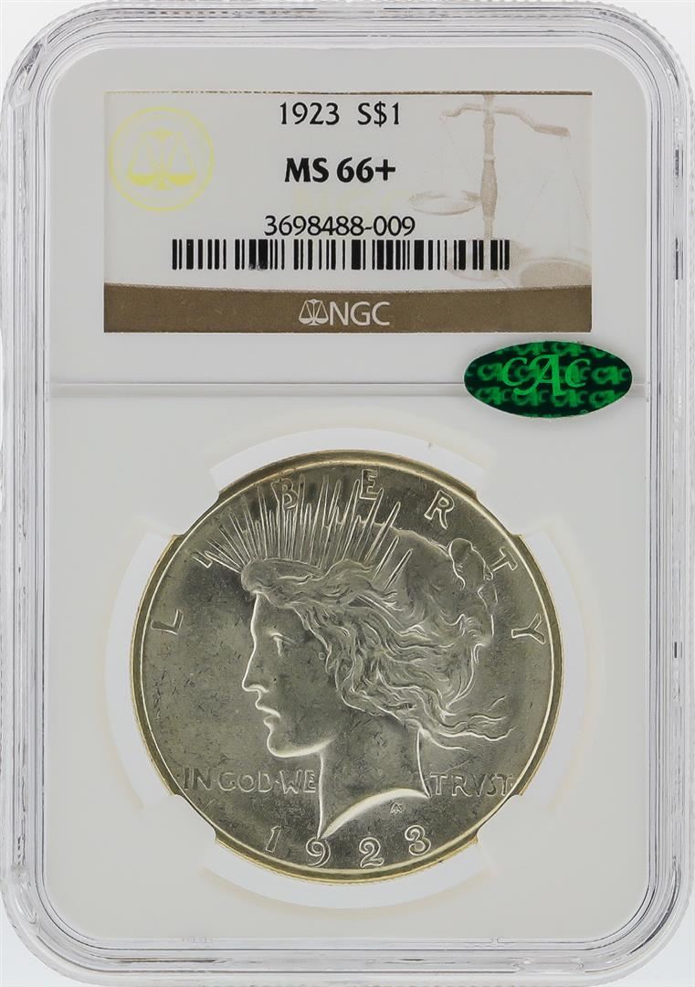 One 1923 $1 Peace Silver Dollar NGC Graded MS66+ CAC. NGC Certified.