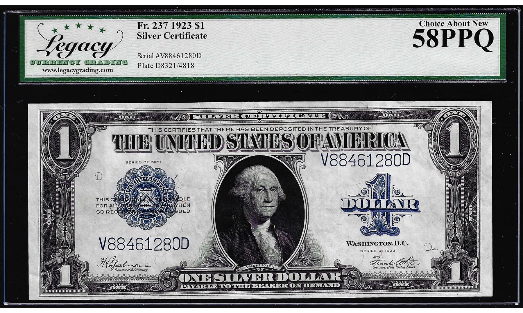 One 1923 $1 Silver Certificate Note Fr.237 Legacy Choice About New 58PPQ. Legacy Graded.