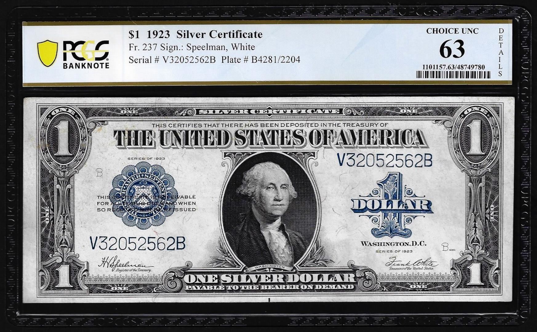 1923 $1 Silver Certificate Note Fr.237 PCGS Choice Unc 63 Details