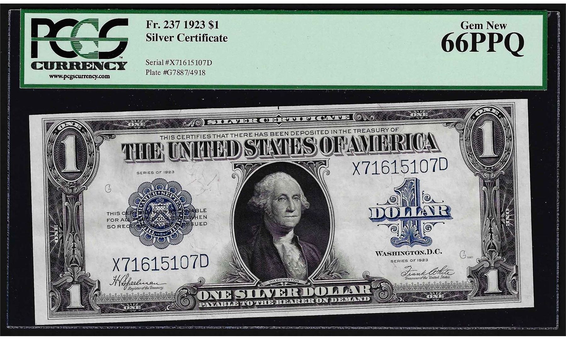 One 1923 $1 Silver Certificate Note Fr.237 PCGS Gem New 66PPQ. PCGS Graded.