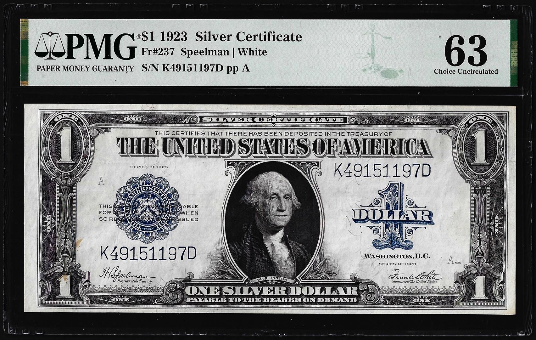 One 1923 $1 Silver Certificate Note Fr.237 PMG Choice Uncirculated 63. PMG Certified.
