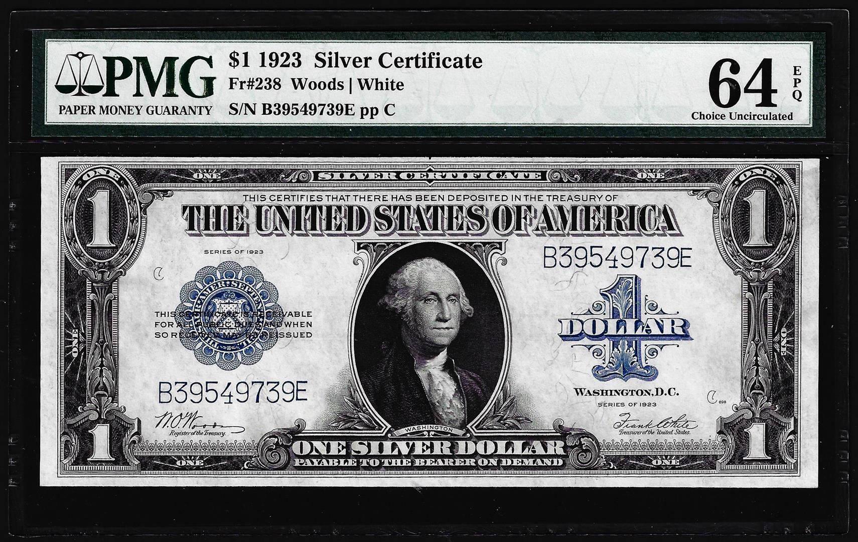 One 1923 $1 Silver Certificate Note Fr.238 PMG Choice Uncirculated 64EPQ. PMG Certified.