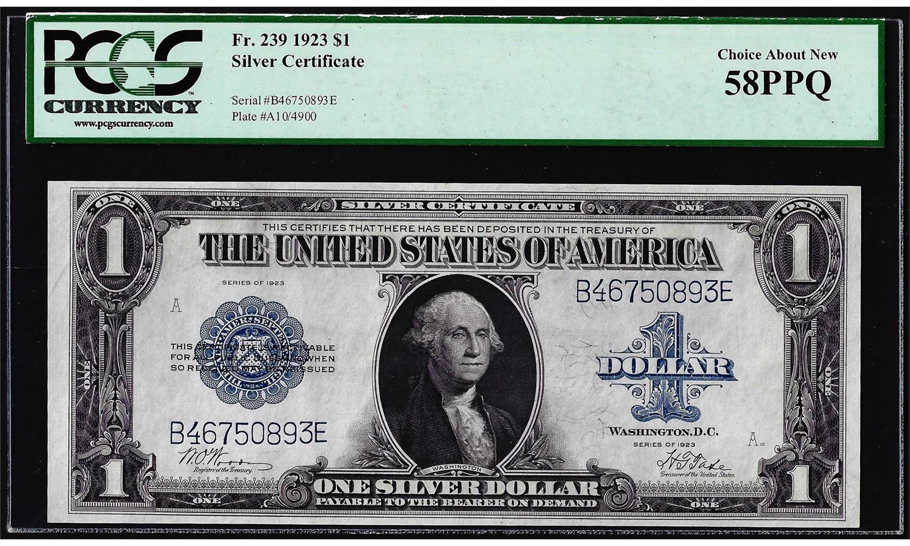 One 1923 $1 Silver Certificate Note Fr.239 PCGS Choice About New 58PPQ. PCGS Graded.