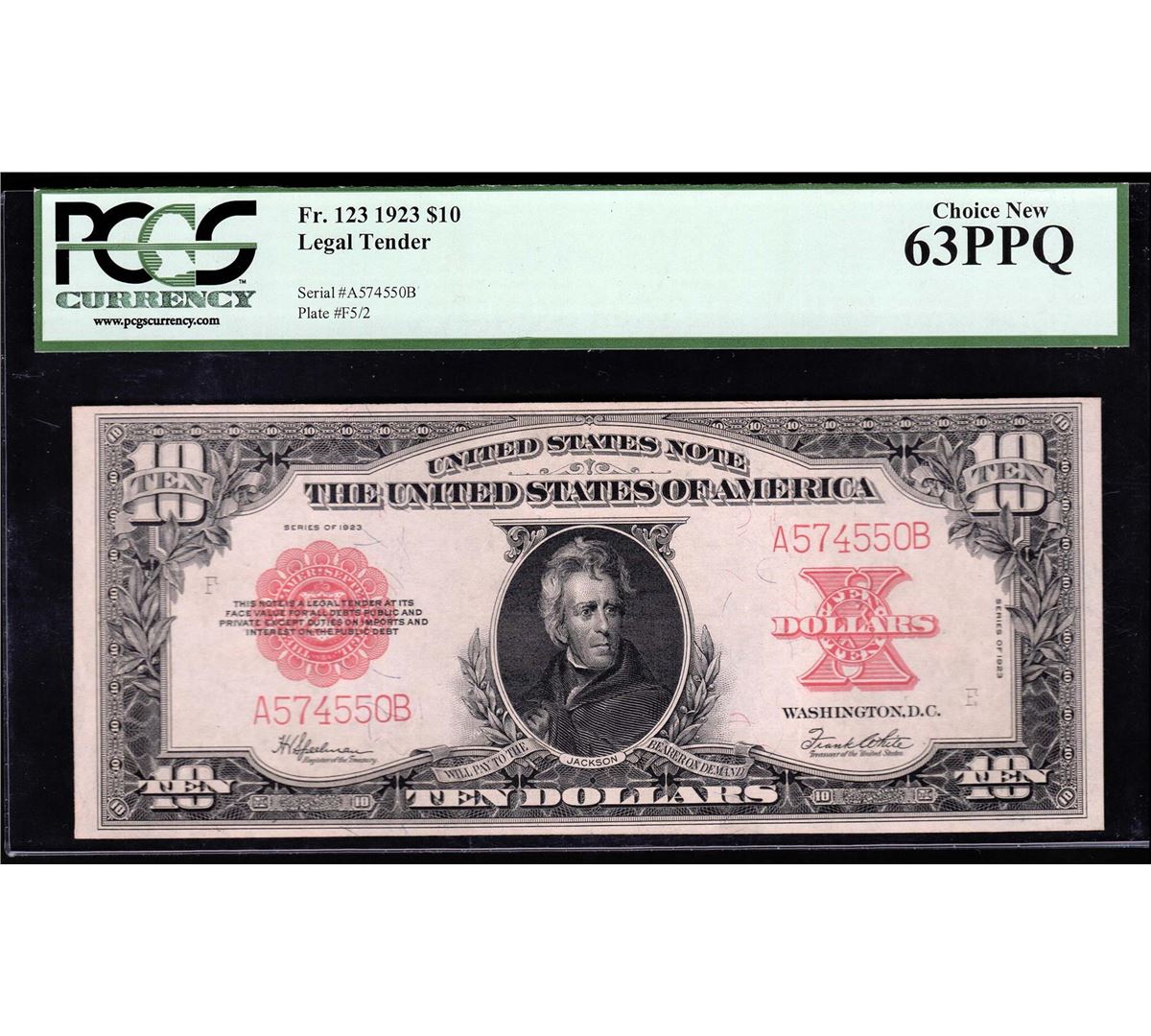 One 1923 $10 Legal Tender Red Seal 'Poker Chip' Note PCGS Graded Choice Uncirculated 63PPQ. Collectors refer to 1923 $10 United States Notes as pokerchips. They got this nickname because the reverse of the note has two radiating disks that look like vint PCGS Graded.