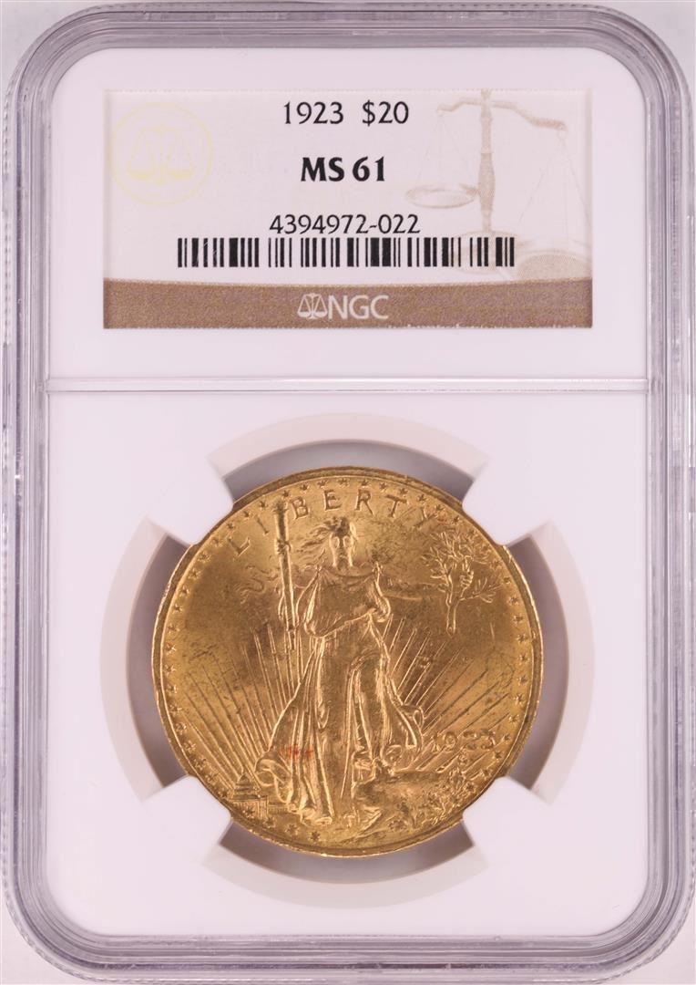 One 1923 $20 St. Gaudens Double Eagle Gold Coin NGC MS61. NGC Certified.