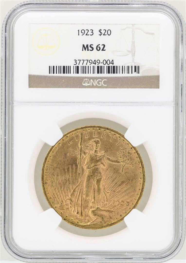 One 1923 $20 St. Gaudens Double Eagle Gold Coin NGC MS62. NGC Certified.