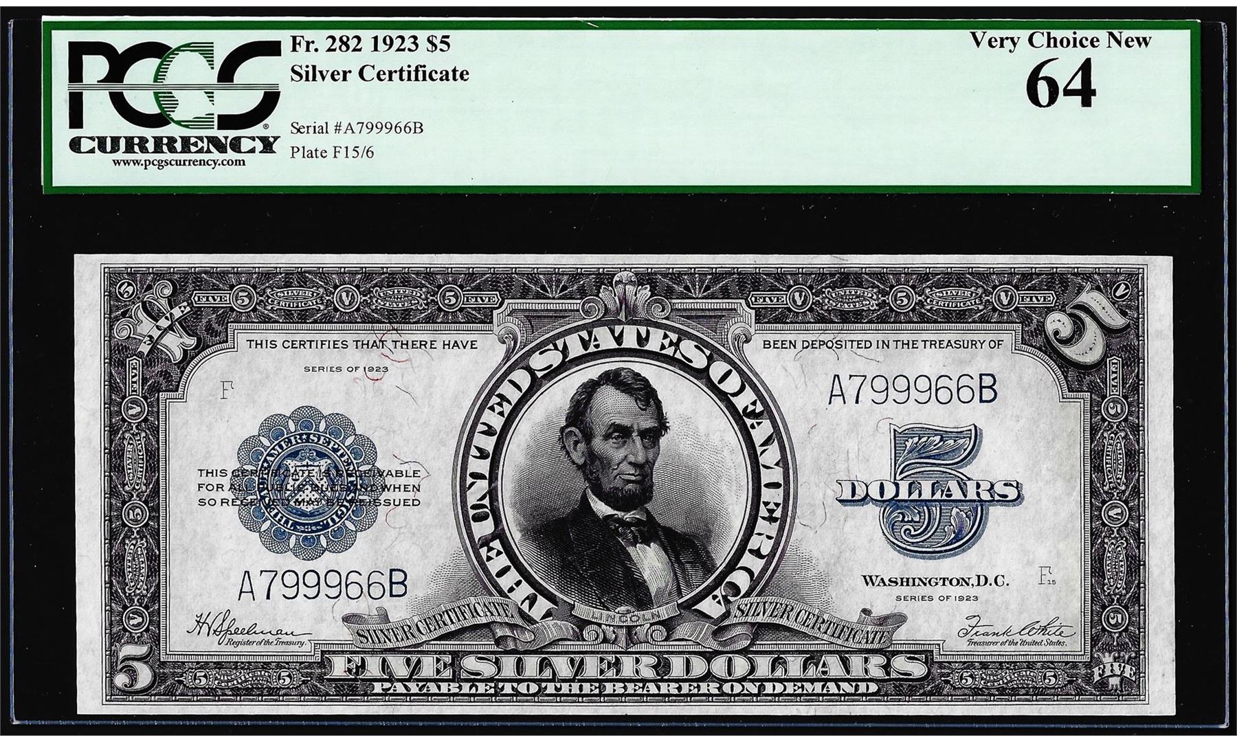 One 1923 $5 Porthole Silver Certificate Note Fr.282 PCGS Very Choice New 64. PCGS Graded.