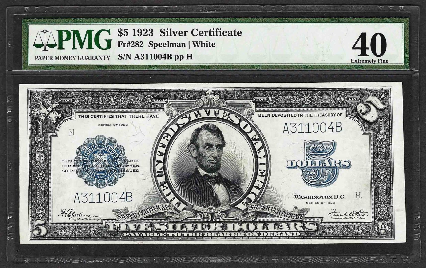 One 1923 $5 Porthole Silver Certificate Note PMG Extremely Fine 40. PMG Certified.