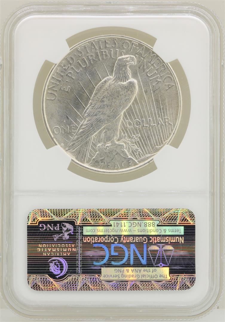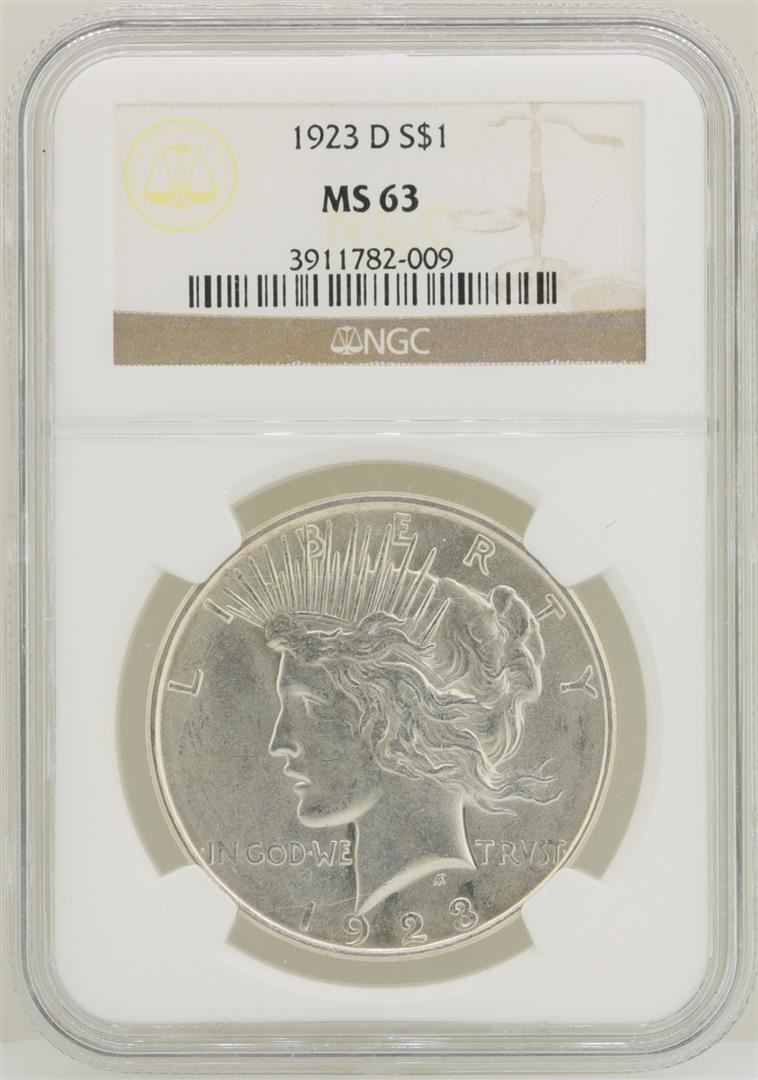 One 1923-D $1 Peace Silver Dollar Coin NGC MS63. NGC Certified.