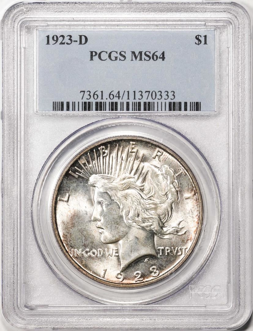 One 1923-D $1 Peace Silver Dollar Coin PCGS MS64. PCGS Graded.