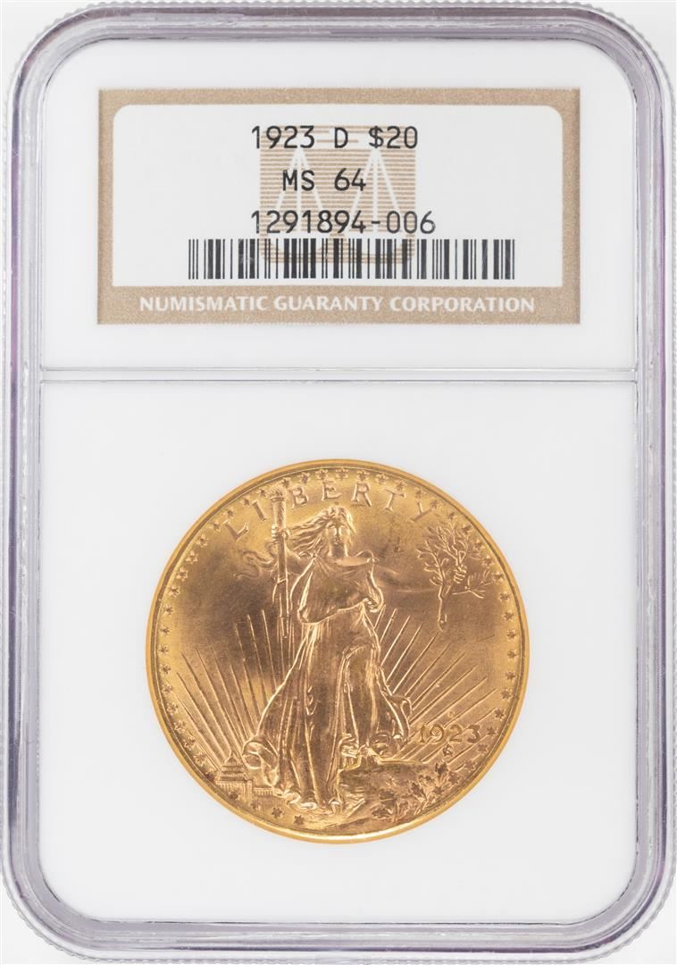 One 1923-D $20 St. Gaudens Double Eagle Gold Coin NGC MS64. NGC Certified.