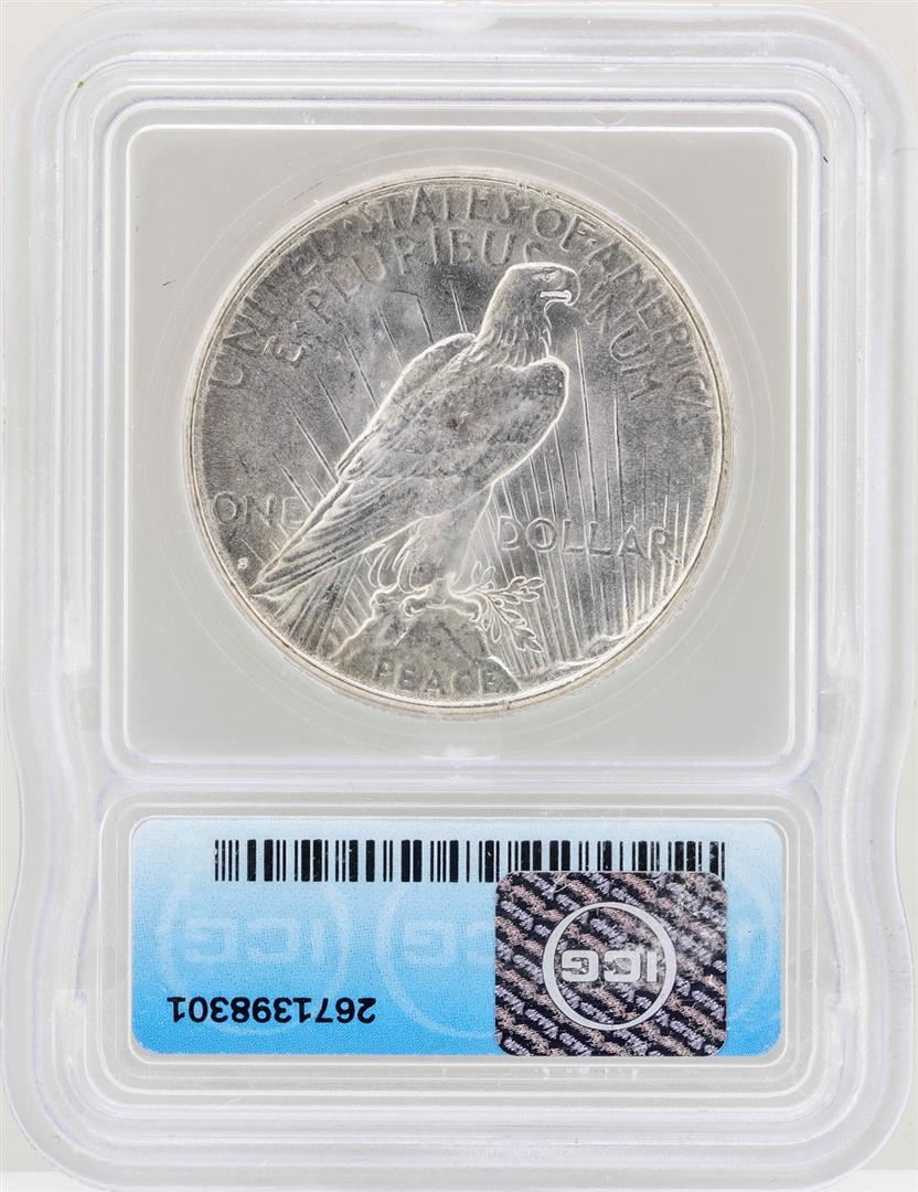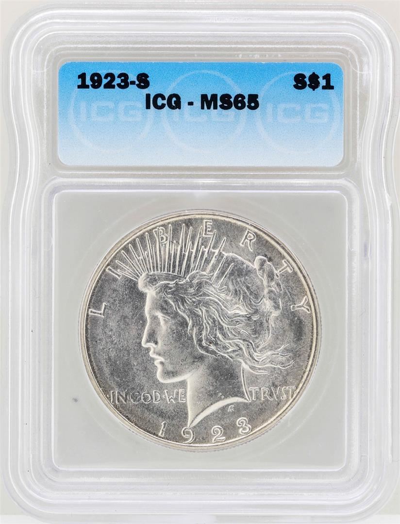 One 1923-S $1 Peace Silver Dollar Coin ICG MS65. ICG Certified.