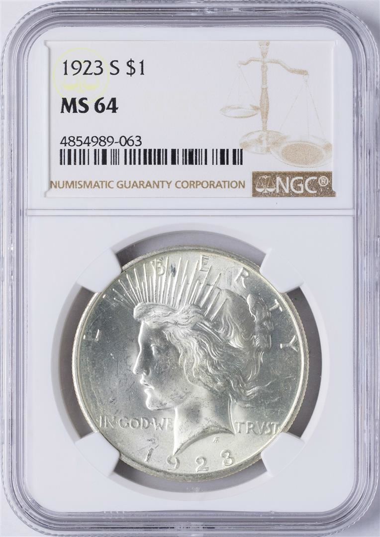 One 1923-S $1 Peace Silver Dollar Coin NGC MS64. NGC Certified.