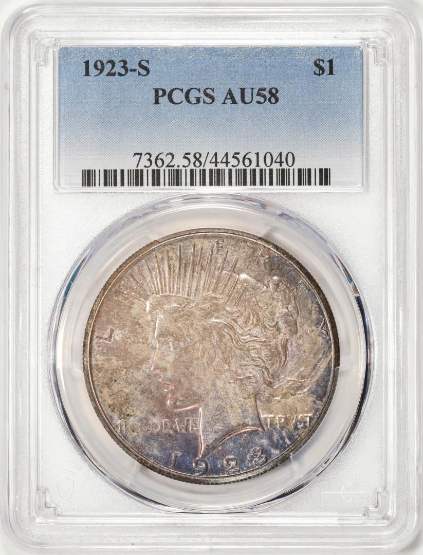 One 1923-S $1 Peace Silver Dollar Coin PCGS AU58 Nice Toning. PCGS Graded.