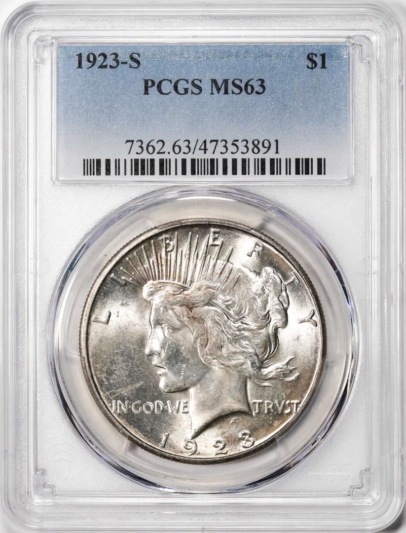 One 1923-S $1 Peace Silver Dollar Coin PCGS MS63. PCGS Graded.