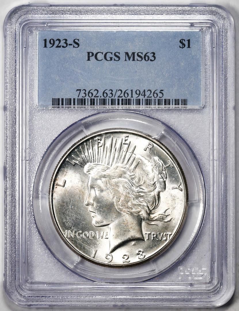 One 1923-S $1 Peace Silver Dollar Coin PCGS MS63. PCGS Graded.