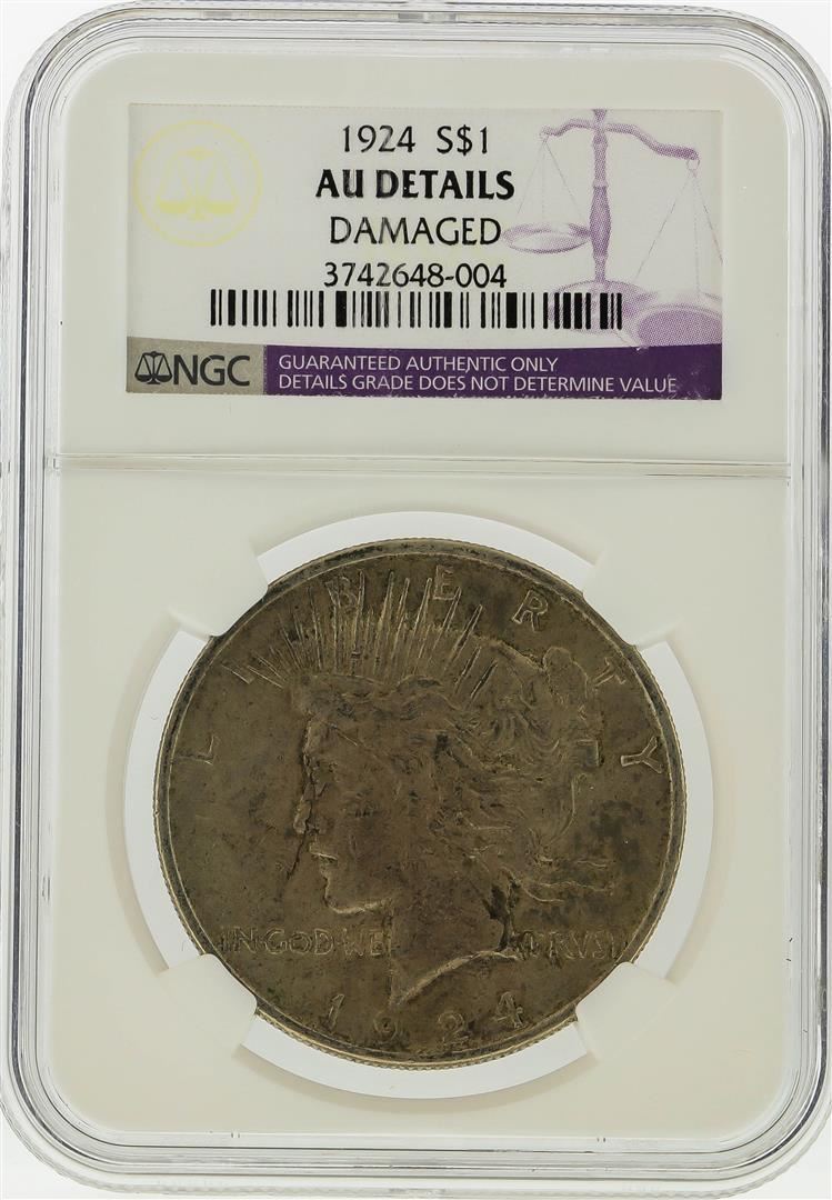 One 1924 $1 Peace Silver Dollar Coin, NGC Graded AU Details Damaged. NGC Certified.