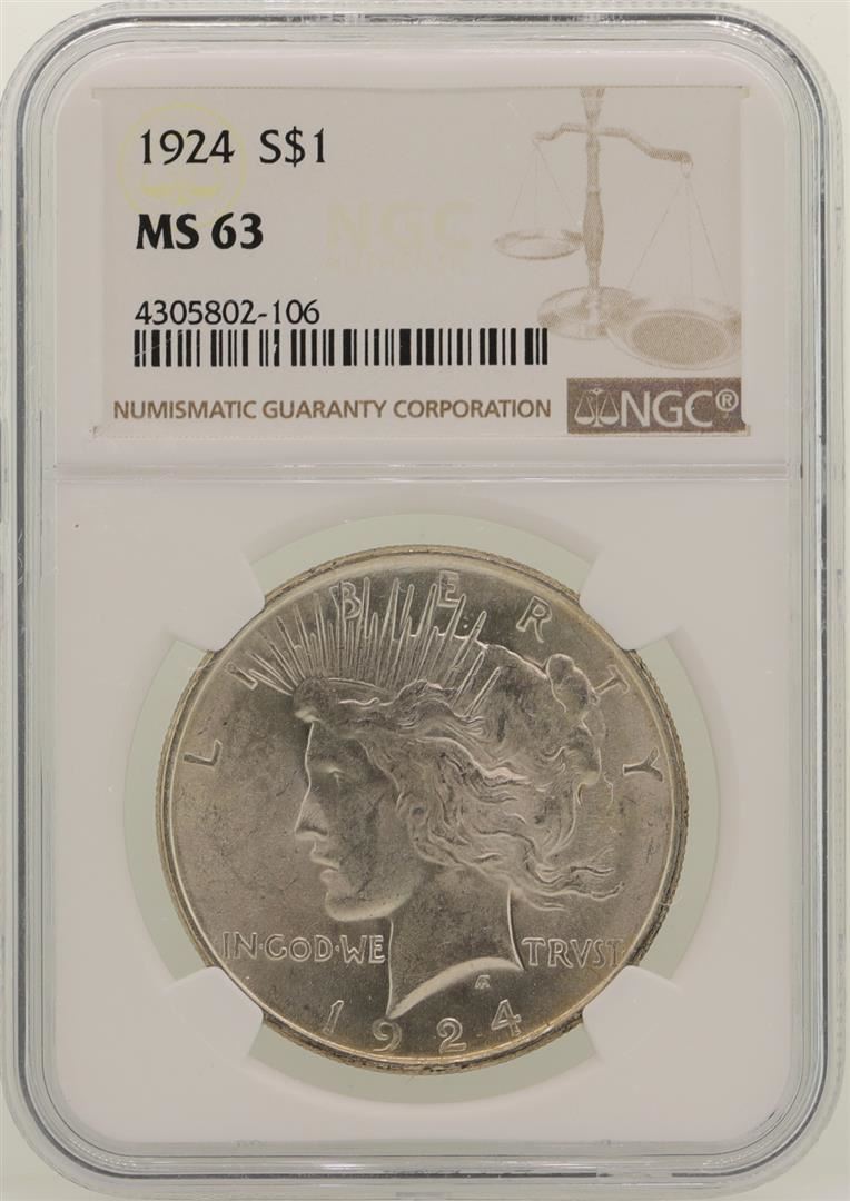 One 1924 $1 Peace Silver Dollar Coin NGC MS63. NGC Certified.