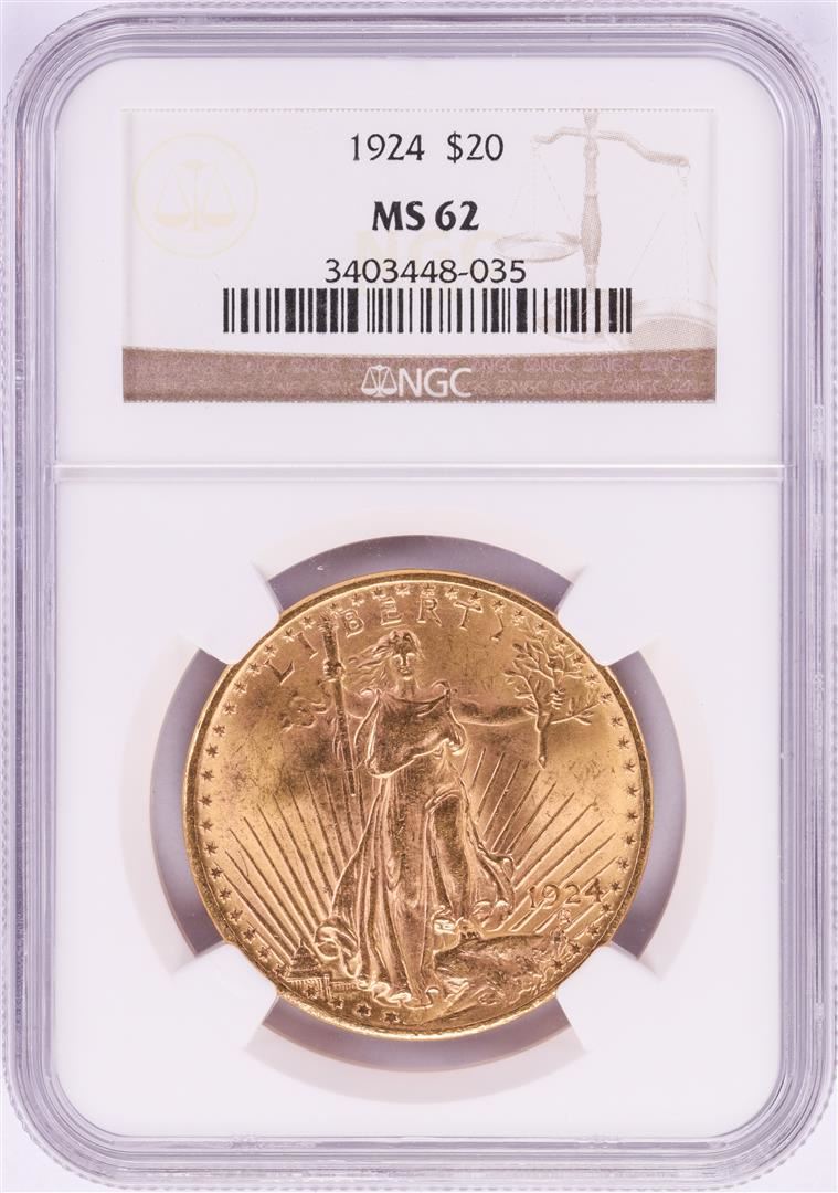 One 1924 $20 St. Gaudens Double Eagle Gold Coin NGC MS62.