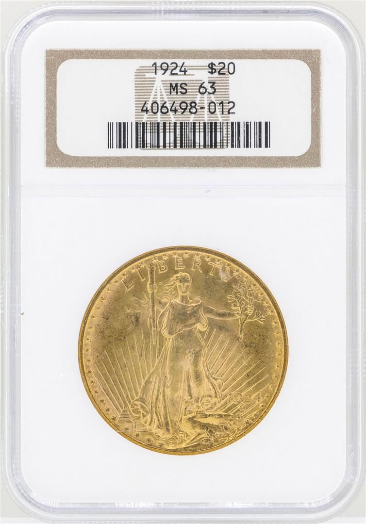One 1924 $20 St. Gaudens Double Eagle Gold Coin NGC MS63. NGC Certified.