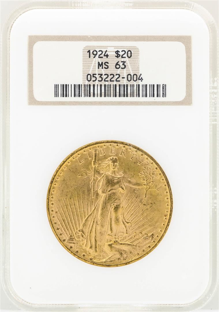 One 1924 $20 St. Gaudens Double Eagle Gold Coin NGC MS63. NGC Certified.