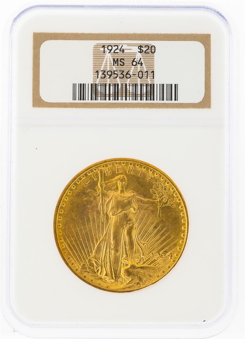 One 1924 $20 St. Gaudens Double Eagle Gold Coin NGC MS64. NGC Certified.