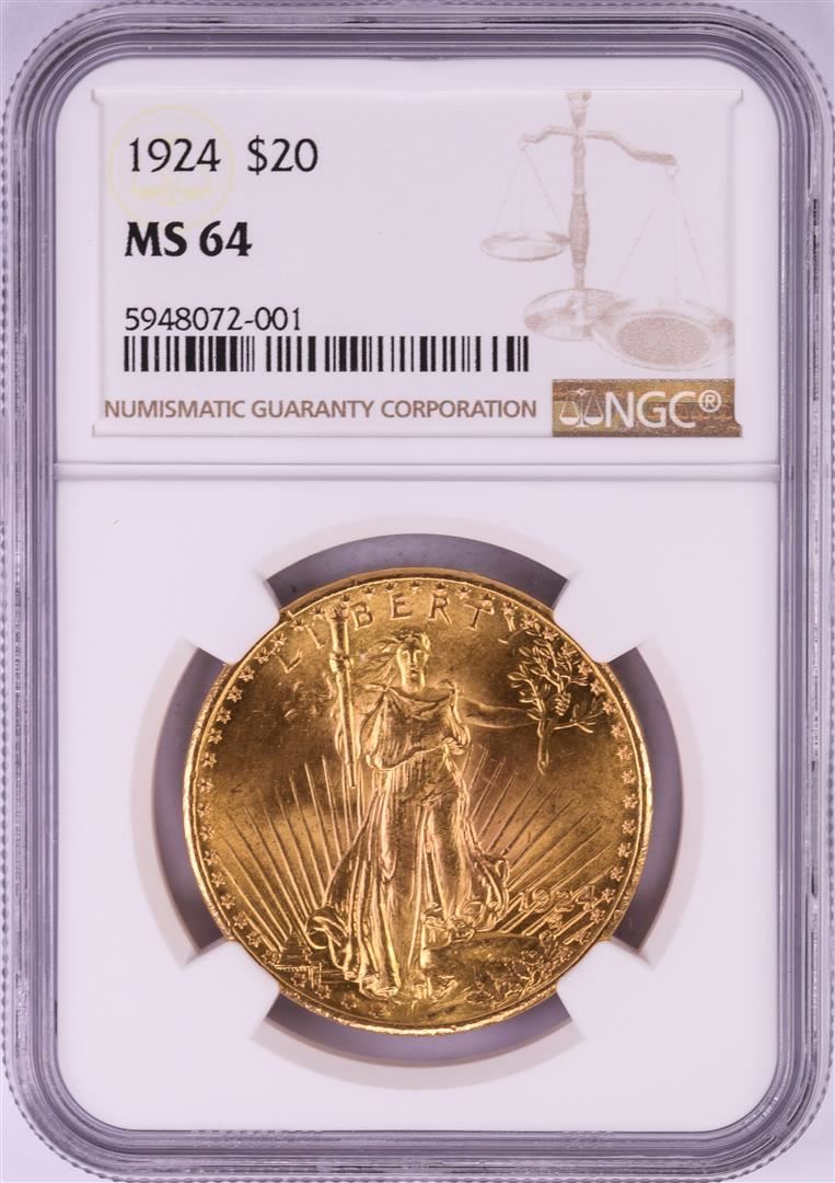 One 1924 $20 St. Gaudens Double Eagle Gold Coin NGC MS64. NGC Certified.