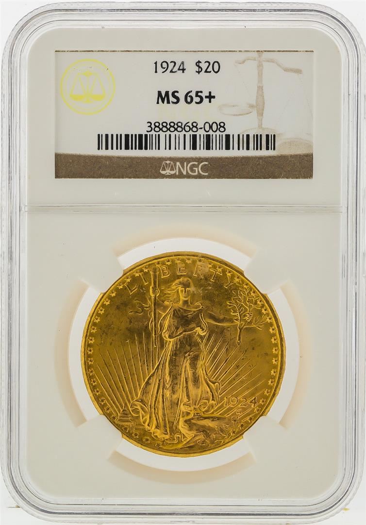 One 1924 $20 St. Gaudens Double Eagle Gold Coin NGC MS65+. NGC Certified.