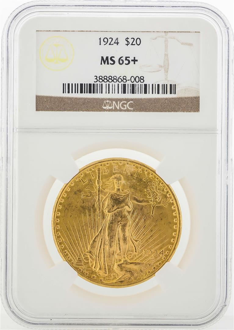 One 1924 $20 St. Gaudens Double Eagle Gold Coin NGC MS65+. NGC Certified.