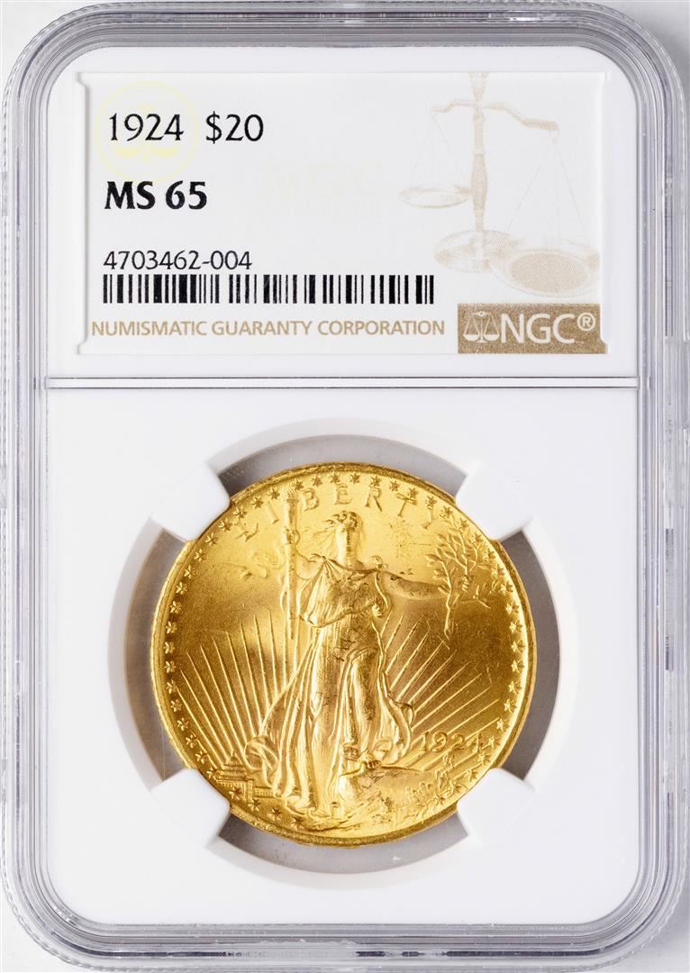 One 1924 $20 St. Gaudens Double Eagle Gold Coin NGC MS65. NGC Certified.